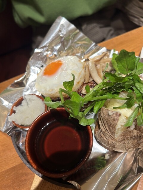 4人でテーブルでハンバーグを食べるってたまににかない贅沢毎回百年ハンバーグ、じゃがいも、トマトサラダがたまらなく食べたくなる!美味しいトマト今回熊本県産でした!食事後にホットカモミールも休まりました。
