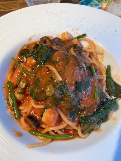 私が訪れた時の日曜日のトマトのパスタのランチはデザート &飲み物ついて1,800円でした