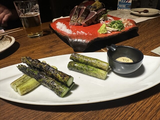 平日ふらっと訪問しました!内装は薄暗くおしゃれで広々ーでした。わら焼きは人生初いただきましたが最高ーに美味!定番の塩かつお最高すぎました。アスパラも良き!お通しの野菜スティックは選べるドレッシングで、味噌、辣油、マヨネーズ、生姜の4択。味噌と辣油をチョイス、個人的には辣油がヒットしました!どれもカツオのほぐされたものが混ざっているようで、美味し。