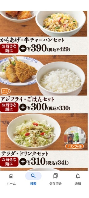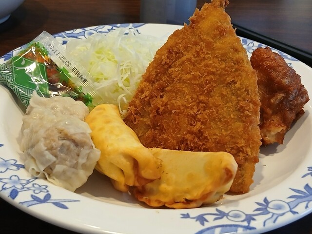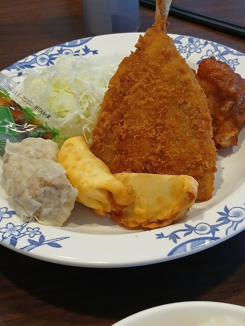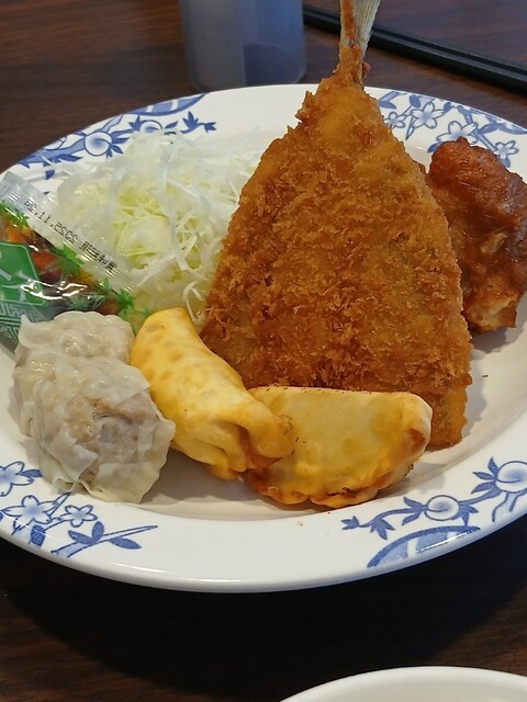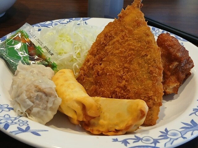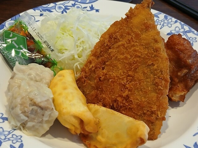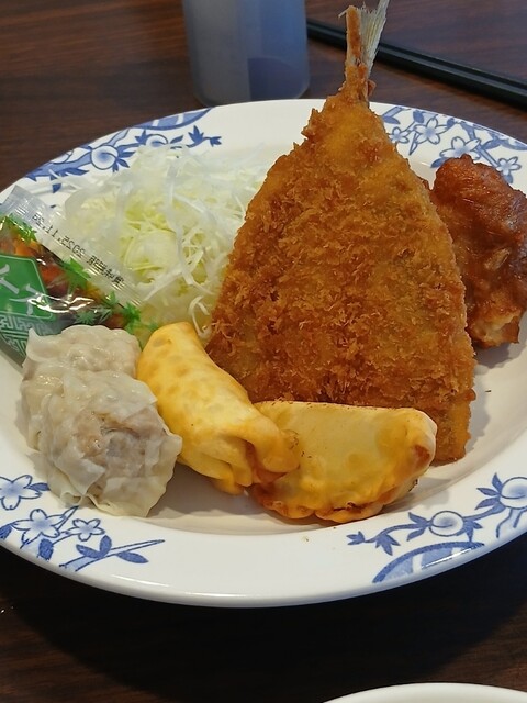 バーミヤン横須賀ベイスクエア店(@^^)/~~~さんにやって来ました(笑)☀️(`Д´≡`Д´)??こちらは京急汐入駅を(^∧^)降りて、スクエア裏側の道を歩くとありますねぇ(笑)近くにはしゃぶ葉もあります。買い出し3件したので小休止したいと思います(爆)半チャーハンかアジフライご飯にしようかなと思いましたが?日替わりランチ☀️(@^^)/~~~で中華ミックスフライなるものがありましたので、それにしました(笑)アジフライ、から揚げ×2、揚げ餃子×2、焼売×2キャベツソース、マヨネーズ付き、スープバー付き、それにドリンクバー110円でつけれました(笑)☀️ドリンクはコーラ、ジンジャーエール、レモン、オレンジ、アイス抹茶ラテ、黒烏龍茶、野菜ジュース、またコーラ、お冷やいただきました(笑)追加で焼餃子、大盛りフライドポテトを頼み、まったりしますね(笑)☀️けっこう時間経ちましたので?お暇します。ご馳走様でした。のんびりしました(笑)