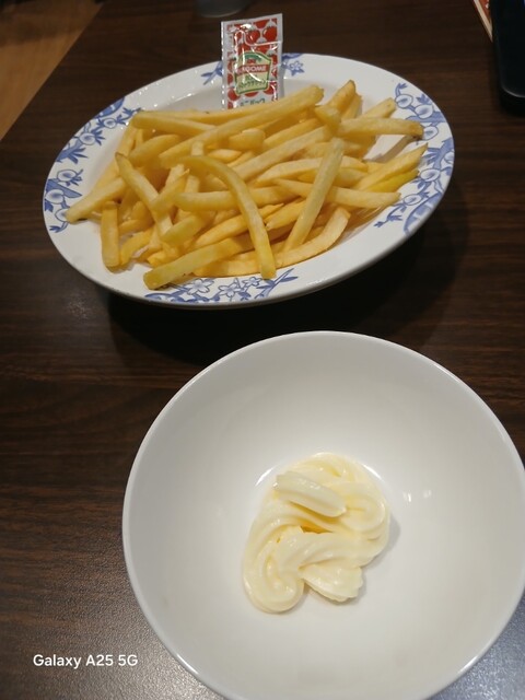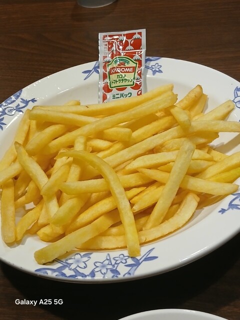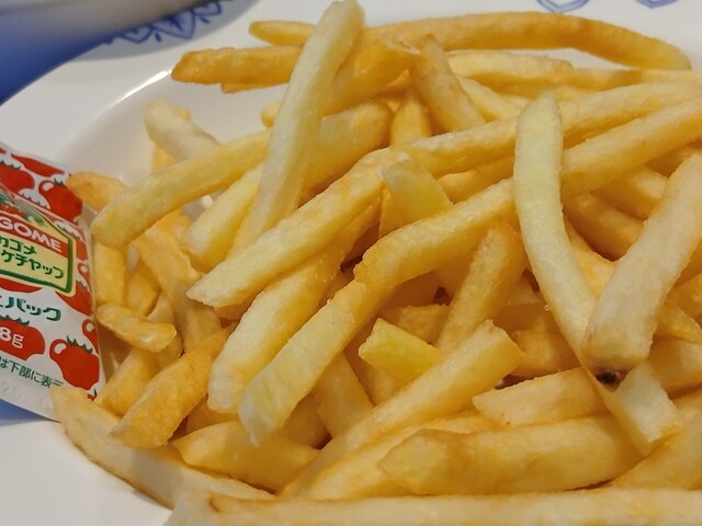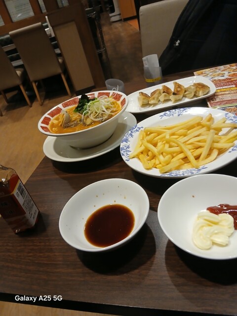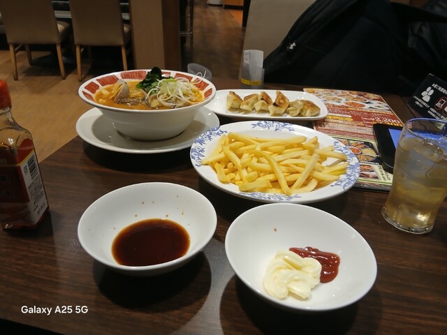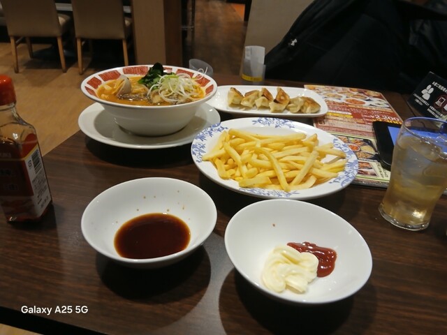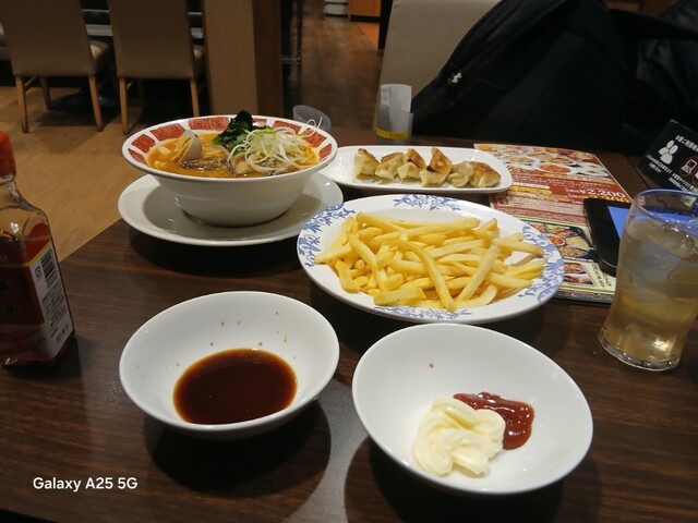 ドリンクバー✨発動、ファストドリンクはコーラ、白ぶどう、抹茶ラテホット、お冷や、待ちます(笑)☀️(`Д´≡`Д´)??例によってこないんですが⁉️ジンジャーエール、オレンジ、追加ですから(笑)山盛りポテトケチャップ&マヨネーズ、焼き餃子頼みました(爆)(@^^)/~~~気を付けないといけないのは?33%クーポンに何故か餃子10%が紛れています?ついでに頼む人を(^∧^)狙ってるんでしょうか(笑)☀️(`Д´≡`Д´)??別クーポンから100円引きで頼みました(爆)(@^^)/~~~残念ながらポテト、焼き餃子が先に来てしまいました。またかよ…ラーメンは完全に忘れられていました。さすがに店員を呼んで注意。ようやく揃いました?ふざけやがって(笑)