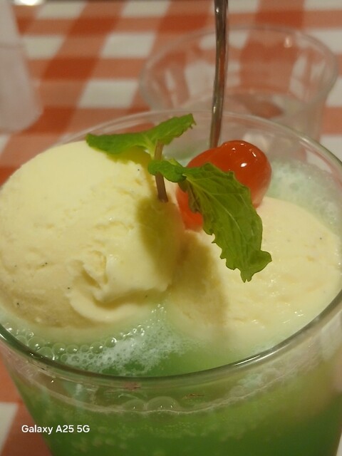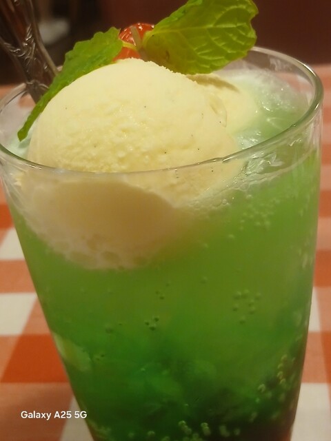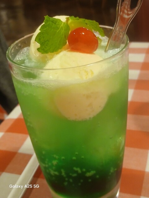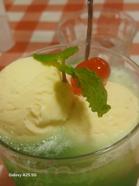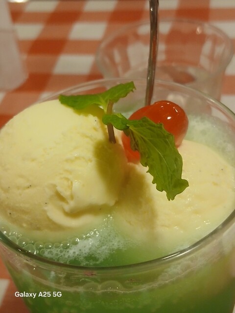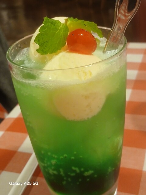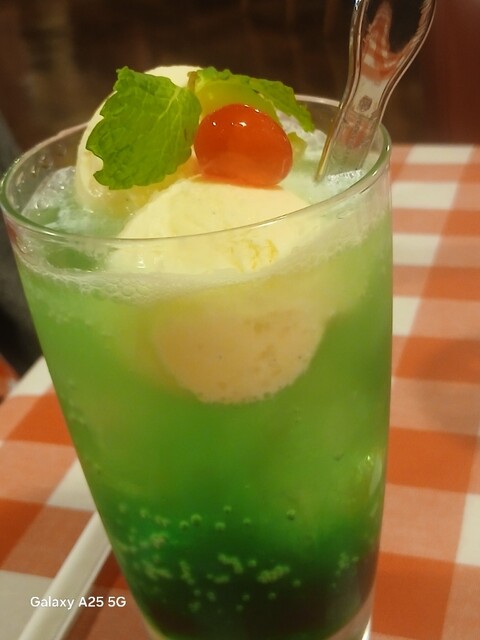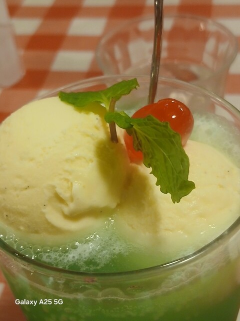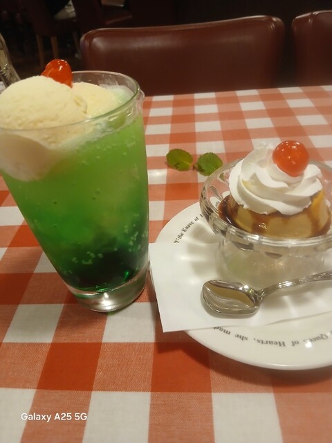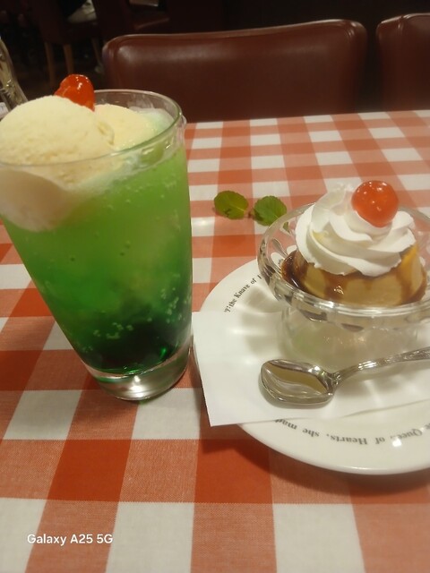 定番のクリームソーダ&カラメルプリンにしました(爆)チェリーではなくお菓子の何かが❓(@^^)/~~~のっています。クリームソーダは最近はメロン意外けっこうありますねぇ(爆)(@^^)/~~~