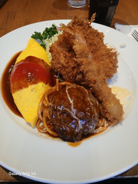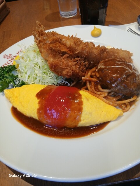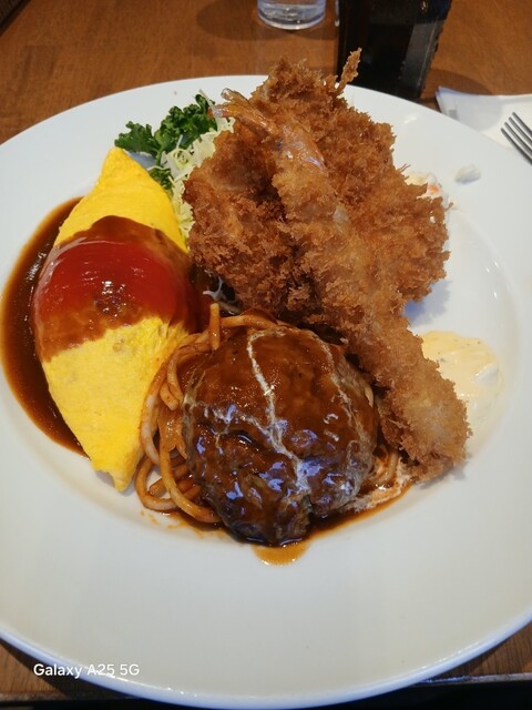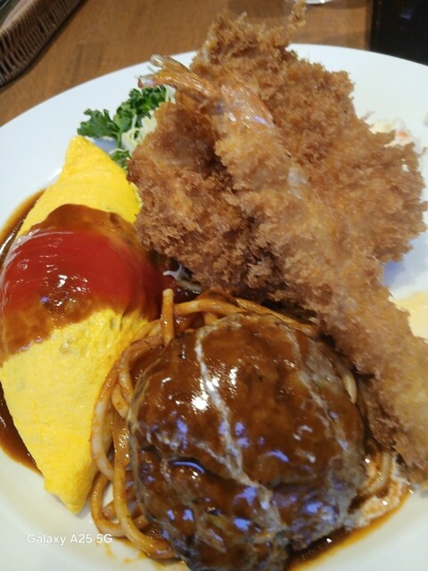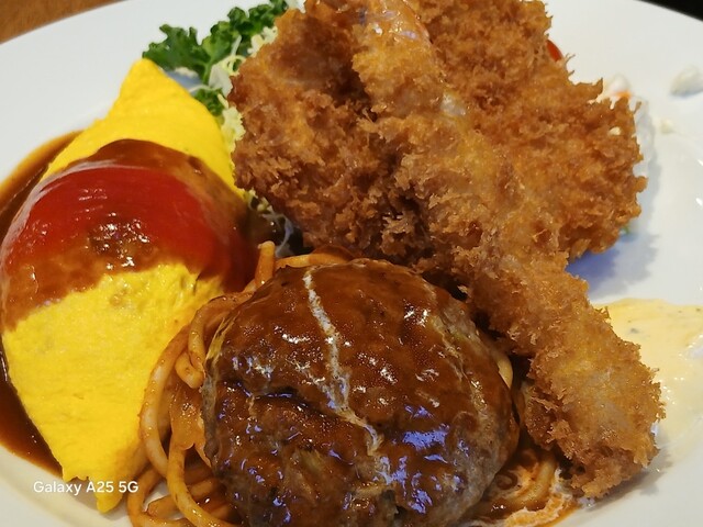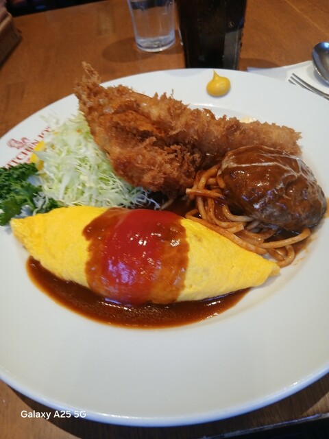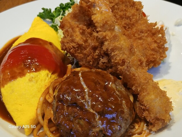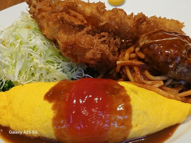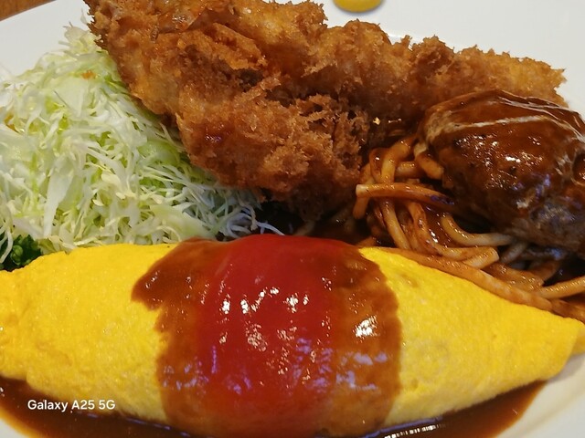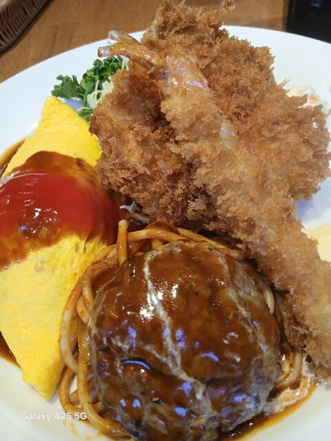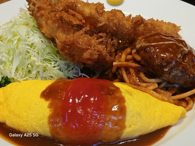 チェーン店(@^^)/~~~はありがたい存在ですねぇ(笑)☀️(`Д´≡`Д´)??個人店はいつ休みか分かりませんからねぇ(爆)(@^^)/~~~クワバラくわばら。こちらはオムライスメインの洋食レストランですねぇ(笑)☀️(`Д´≡`Д´)??この時間は食事だけのようですねぇ(爆)(@^^)/~~~お客はいなかったので?奥のデカイテーブルに陣取りました(笑)前から気になっていたメニューにしました(爆)大人のお子様ランチ☀️です。要はお殿様ランチ☀️全部乗せです。✨豪華絢爛です。食事ドリンクでコカ・コーラを頼みました(笑)☀️(`Д´≡`Д´)??その後はお客さんが入って来ましたので、提供は遅めになります(爆)(@^^)/~~~ワンプレートのデカイ皿が来ました(笑)ケチャップオムライス、粗挽きハンバーグ、ナポリタンスパゲッティ、海老フライ、タルタルソースつき、ポテトサラダ、キャベツサラダ、チキンカツ、オールスター揃いました(笑)☀️(`Д´≡`Д´)??キャベツにソースを(^∧^)かければ(爆)(@^^)/~~~完成です。まずはキャベツ、シャキシャキです。ご飯玉子とろとろです。チキンカツ、ザクザク食感が楽しい。海老フライ、タルタルソース旨し。