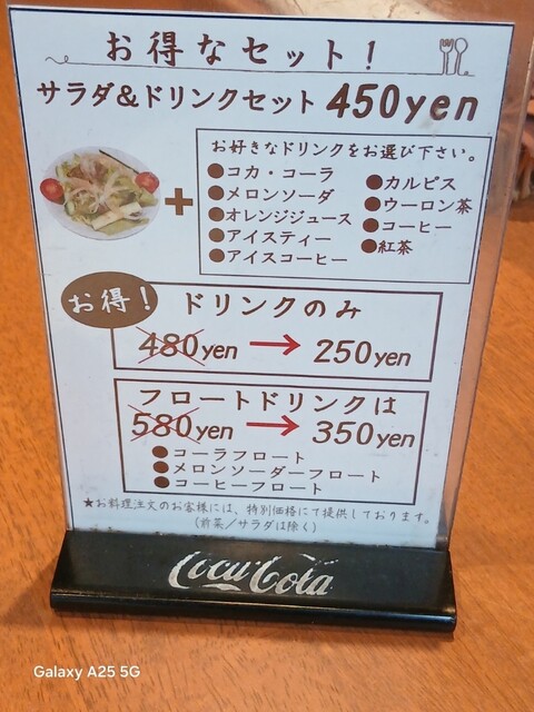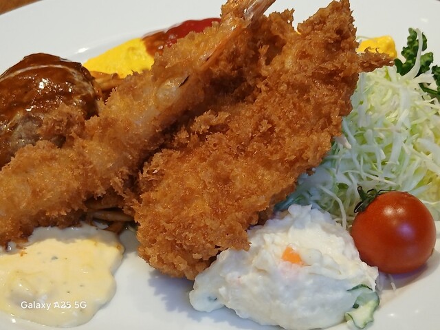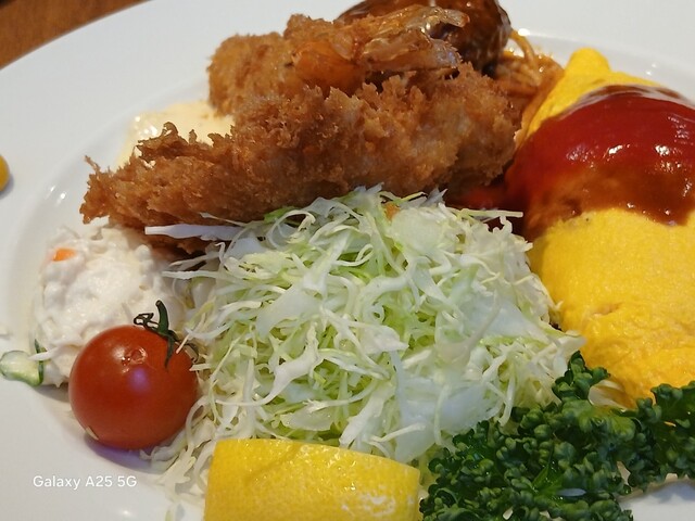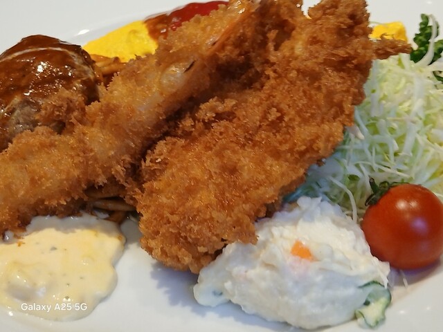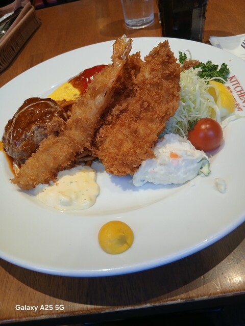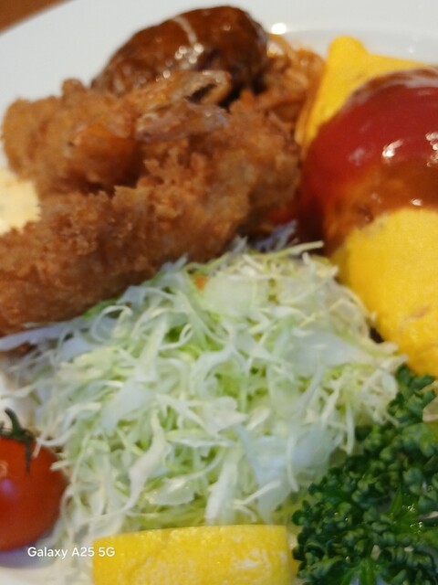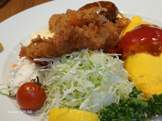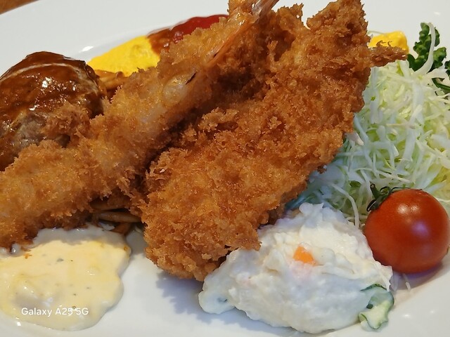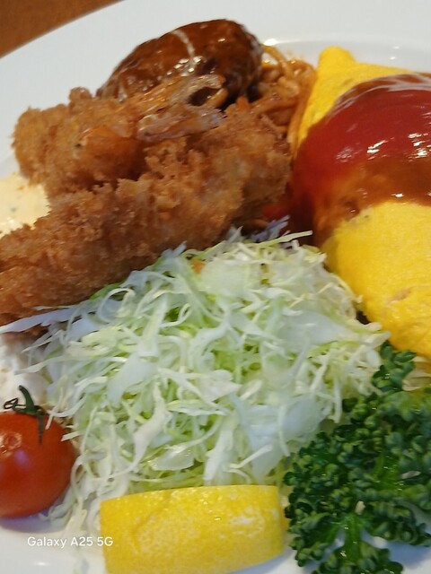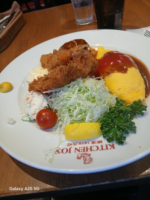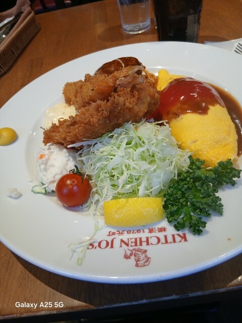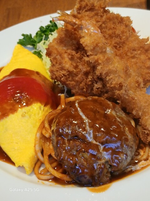 チェーン店(@^^)/~~~はありがたい存在ですねぇ(笑)☀️(`Д´≡`Д´)??個人店はいつ休みか分かりませんからねぇ(爆)(@^^)/~~~クワバラくわばら。こちらはオムライスメインの洋食レストランですねぇ(笑)☀️(`Д´≡`Д´)??この時間は食事だけのようですねぇ(爆)(@^^)/~~~お客はいなかったので?奥のデカイテーブルに陣取りました(笑)前から気になっていたメニューにしました(爆)大人のお子様ランチ☀️です。要はお殿様ランチ☀️全部乗せです。✨豪華絢爛です。食事ドリンクでコカ・コーラを頼みました(笑)☀️(`Д´≡`Д´)??その後はお客さんが入って来ましたので、提供は遅めになります(爆)(@^^)/~~~ワンプレートのデカイ皿が来ました(笑)ケチャップオムライス、粗挽きハンバーグ、ナポリタンスパゲッティ、海老フライ、タルタルソースつき、ポテトサラダ、キャベツサラダ、チキンカツ、オールスター揃いました(笑)☀️(`Д´≡`Д´)??キャベツにソースを(^∧^)かければ(爆)(@^^)/~~~完成です。まずはキャベツ、シャキシャキです。ご飯玉子とろとろです。チキンカツ、ザクザク食感が楽しい。海老フライ、タルタルソース旨し。