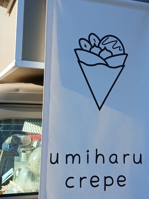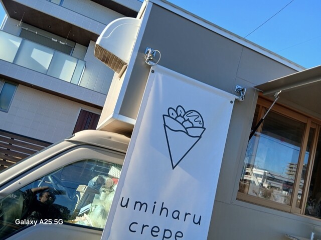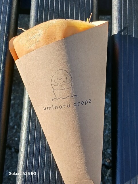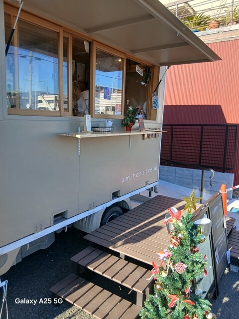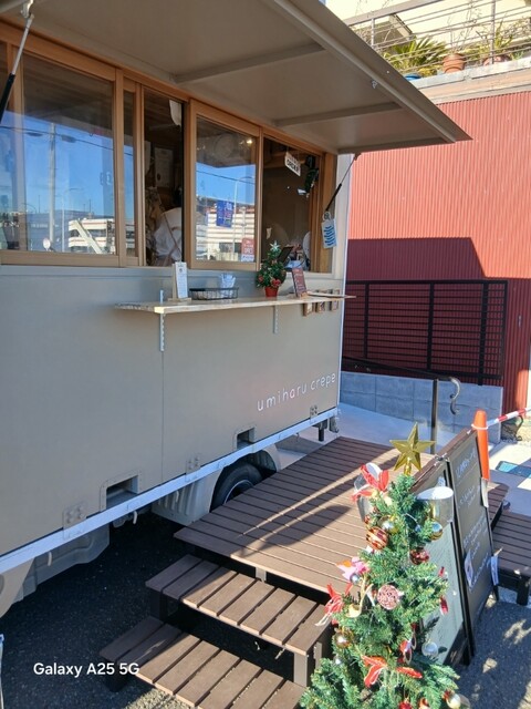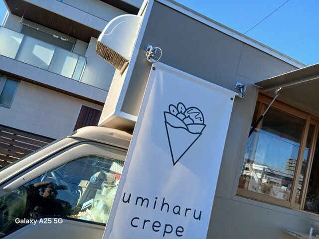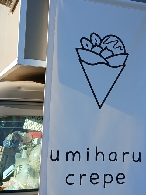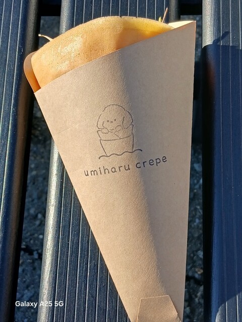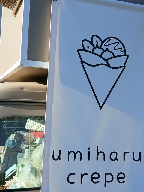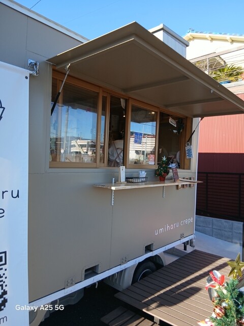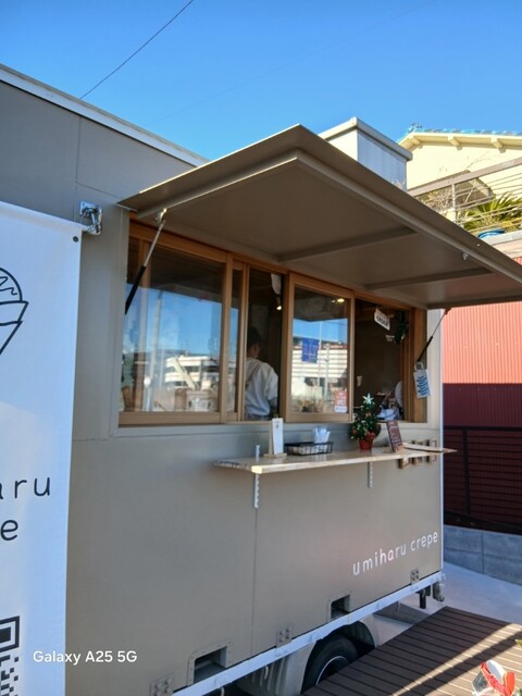 うみはるクレープ店(@^^)/~~~さんにやって来ました(笑)☀️(`Д´≡`Д´)??☀️こちらは京急堀ノ内駅を(^∧^)降りて、バス停留所1つ進んだ所、元バス営業所があった所のといめん、駐車場にキッチンカーが止まっております(爆)(@^^)/~~~前は女性2人でやっていたと思いますが(笑)☀️(`Д´≡`Д´)??今はワンオペらしいので、提供はかなり遅い➰ですねぇ(爆)(@^^)/~~~それはさておき、何回か来て空振りを(^∧^)繰り返していました(笑)☀️(`Д´≡`Д´)??個人店(@^^)/~~~ですので?時間、曜日はけっこう変更になる気がします。よく確認してから来た方が良いと思いますが(笑)☀️(`Д´≡`Д´)??先客2組、あとから1組来ました(笑)イートインはベンチ2~3人座れます(爆)(@^^)/~~~テイクアウトは袋に入れてくれるみたい(@^^)/~~~です。