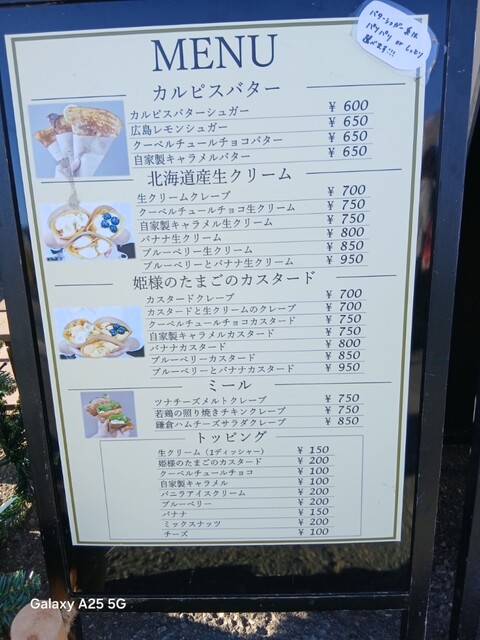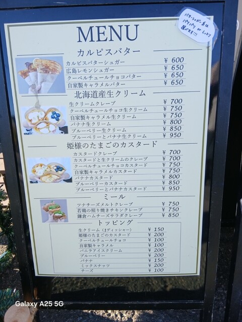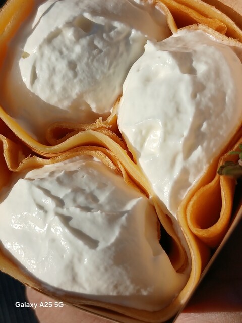 シンプルはカルピスバター、クリームが好きなら生クリーム、カスタードが好きなら姫様の玉子、ミールのおかず系もありますねぇ(笑)☀️(`Д´≡`Д´)??インスタを(^∧^)見れば最新の高いやつがやっております(爆)(@^^)/~~~私は生クリームが好きなので(笑)生クリームクレープを頼みました(爆)(@^^)/~~~後は待つだけです。