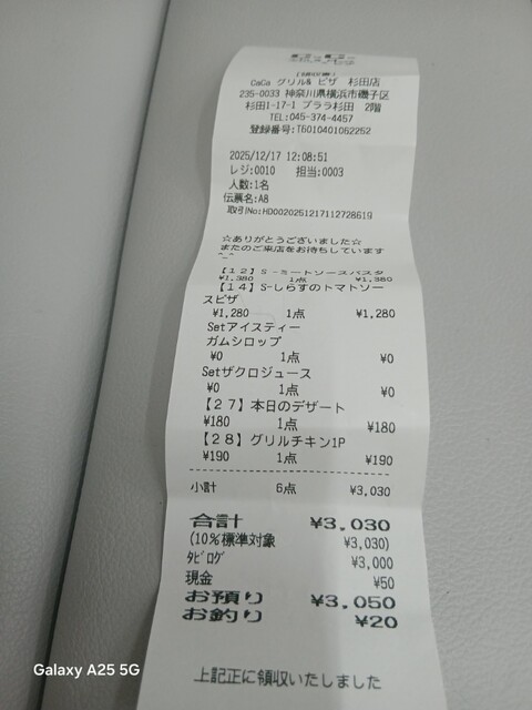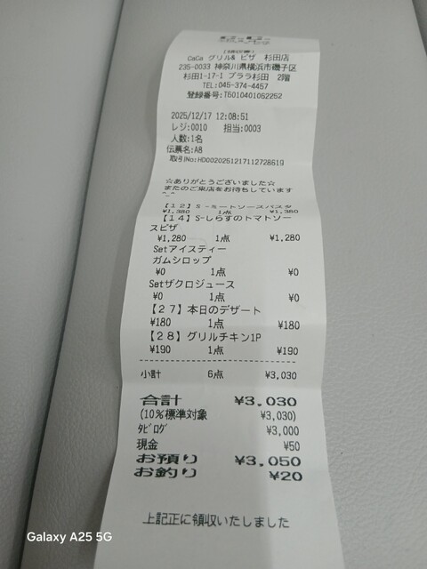 CaCa Grill &Pizza 杉田店(@^^)/~~~さんにやって来ました(笑)☀️(`Д´≡`Д´)??☀️こちらは京急杉田駅を(^∧^)降りて、プララ杉田2F にありますねぇ(爆)(@^^)/~~~杉田に、似つかわしくないお店がありました(笑)☀️(`Д´≡`Д´)??周りは古くからある飲食店、居酒屋等ですので?目を引きますねぇ(爆)(@^^)/~~~食べログ予約11:30.3000ポイント使います。ランチ☀️はパスタコース、ピザコースに分かれていますねぇ(笑)☀️(`Д´≡`Д´)??両方食べたい(笑)2つ頼みましょう(爆)女性のリーダー、東南アジア系の男性スタッフ2人がいらっしゃいました。奥の席に陣取り、メニューを見ます(爆)(@^^)/~~~パスタ、ピザ、オーブン焼き、一品料理、アルコール、大体こんな感じでしょうか(笑)☀️(`Д´≡`Д´)??注文はQRコードになります。ミートソース、シラスのピザ、ザクロジュース、アイスティーガムシロップ付きを(^∧^)選択