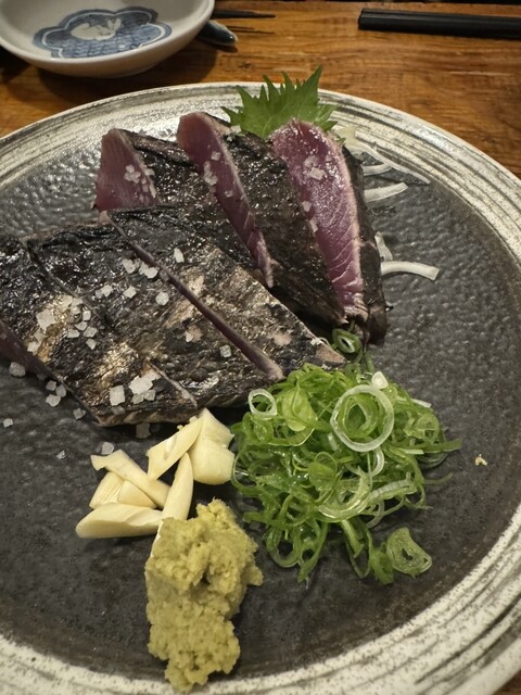 切身が大きく鰹のもっちりとした身質と旨味を存分に味わえました。皮目は香ばしく、岩塩で食べると香りと旨味がより引き立ちます。