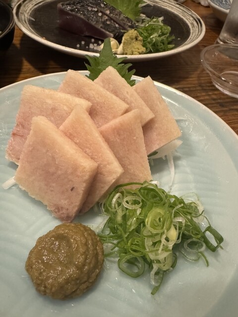 鯨の舌を土佐ぬた(高知伝統の調味料、酢味噌)につけて頂きます。独特の臭みと食感があり私は苦手でした。。次は生食以外の食べ方で味わってみたいです。