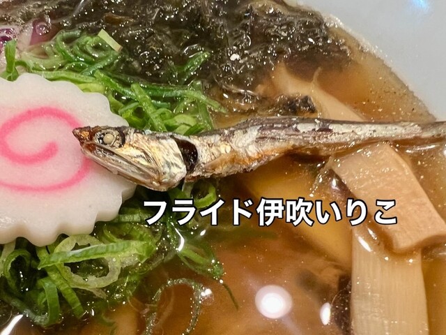 【麺屋おおやまの代名詞「伊吹いりこ」を空煎りし、超低温煮だし製法で摂った伊吹いりて100%スープに伊吹いて油を合わせ、フライドした伊吹いりこをトッピング。