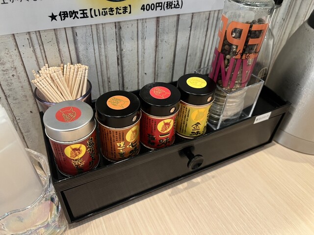 卓上には魅力的な調味料も揃えられており、毎回今回は使おうと着丼するまでは思っているんですが、結局私はデフォルトのスープ美味くて最後まで味変しません!