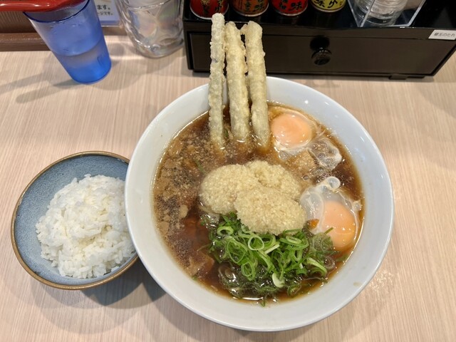 で、「生姜肉肉そば」(肉倍増 1400円 )・ごぼう天150円・月見100円×2+オススメ白ご飯セット(150円)をオーダー。