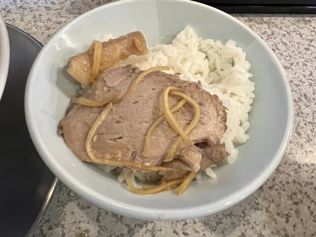途中「半ライス」へ、ホロホロバラ巻きチャーシューや生姜をおすそ分けしながら、完飲完食しました!