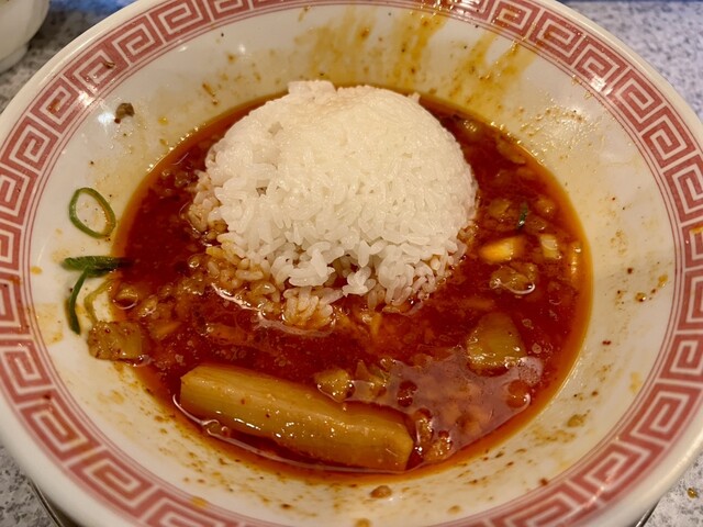 麺をすすり終えたあと「半ライス」を旨辛限界突破+1タレへダイブしてもらいました!