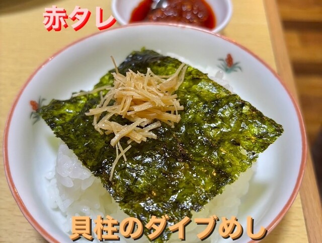 でも、ミニチャーシュー丼(肉の量と白米もミニとは思えない笑)を全て喰らいきってしまって、スープに飯をダイブできないので、「塩貝柱のダイブ飯」(100円)を、現金にて支払い、ダイブさせました!
