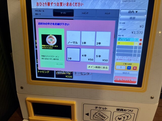 入店&券売機にて、「スパイスラーメン 3辛」(ジャスミンライス・燻たま付 1370円)と、「炙りSP レアチャーシュー」(220円)を購入して、カウンター席に着席成功!