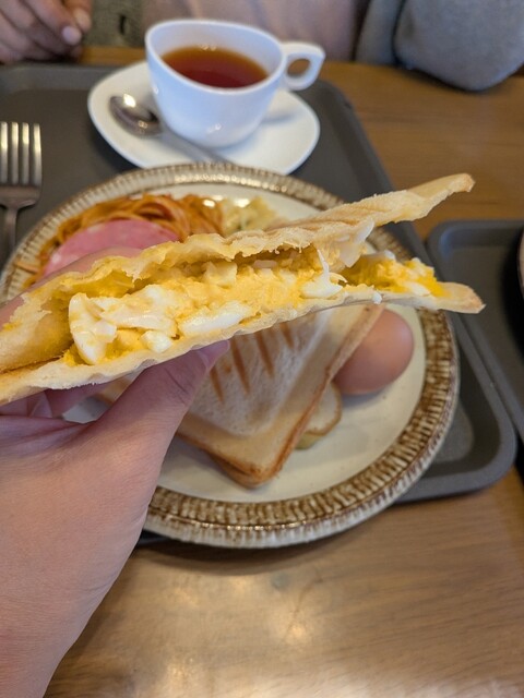 ドリンクとナポリタン、ゆで卵、カレーマカロニ、バナナ、サラダまでついたボリューム満点のモーニングセットが
