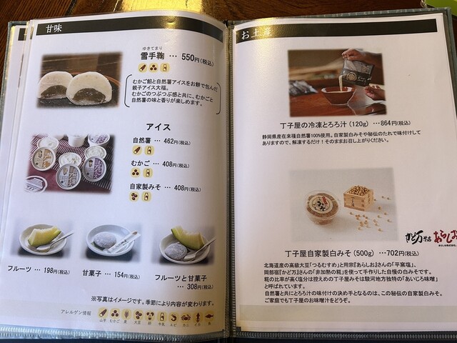 とろろ汁、麦飯、味噌汁、刺身2種、揚げとろ、おかべ餅、珍味2種、甘味。