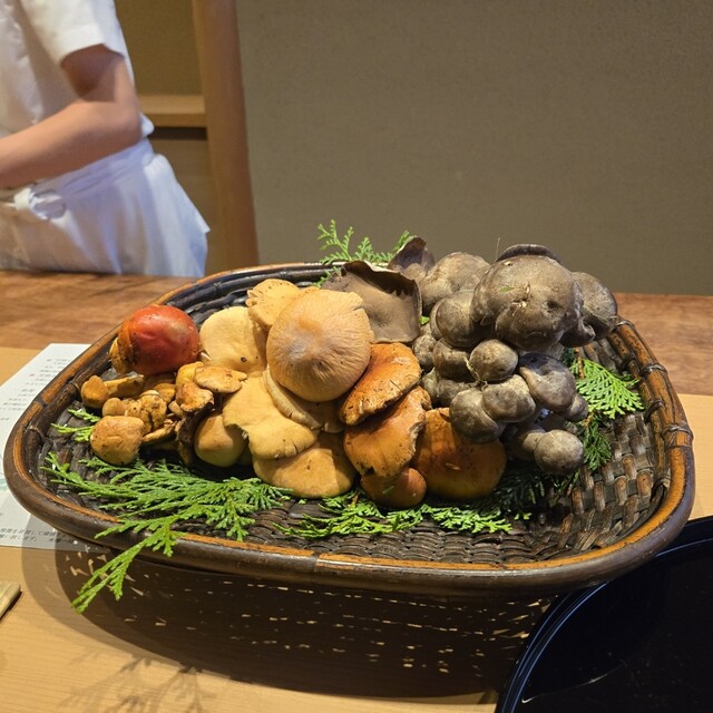 天然キノコ汁(鳴沢村産、ナラタケ、ショウゲンジ、畑しめじ、あいしめじ、ハナイグチ、カワリハツ)、焼き穴子(明石産),里芋の六方むき(真室川町産)、三つ葉
