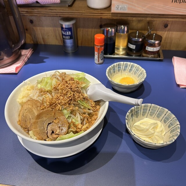 ちょっとした用事を済ませたその後、せっかくだからと久々の外食!無性に久々に二郎系ラーメンが食べたくなり、近辺でまた行ったことのないお店にも行こうかと考えましたがその反面、あの時の味が美味しすぎて忘れられないということもあり、最終的に【豚に恋してる】へ2度目の入店!!前回はラーメンを頼んだので、今回はまぜそばを頂くことに!!(ラーメン食べたかったんじゃなかったんかい!というツッコミが飛んできそう笑) トッピングにマヨネーズも注文してしばらくのんびり席で待っていると着丼!!なんと卵黄が別皿でやってきた!!てっきり看板の写真のように出てくるのかと思いきや別皿での卵黄!もちろんマヨネーズも別皿!なんだか前回よりも量が多いような気がします!せっかくだから卵黄を解いてすき焼きのようにしてまぜそばを食らう!いや美味しすぎる!!卵黄別皿のすき焼き食いってアリだな!となんだか新しい発見をしたかのような感覚です!!もちろんマヨネーズの方にもディップ!前回食べたラーメンも美味しかったけど、今回のまぜそばもとてもジャンクで美味しかったです!!これ絶対また食べに行くやーつ!ですね!!