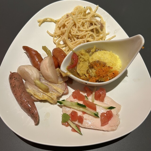 そしてビュッフェのエリアに入るとこれがまた結構豪華!!鶏肉やパスタ、ピザ、サラダなど様々なものがありました!早速様々なものを取っていく!食べてみれば凄く美味しい!私的にはピザとパスタがオススメです!!