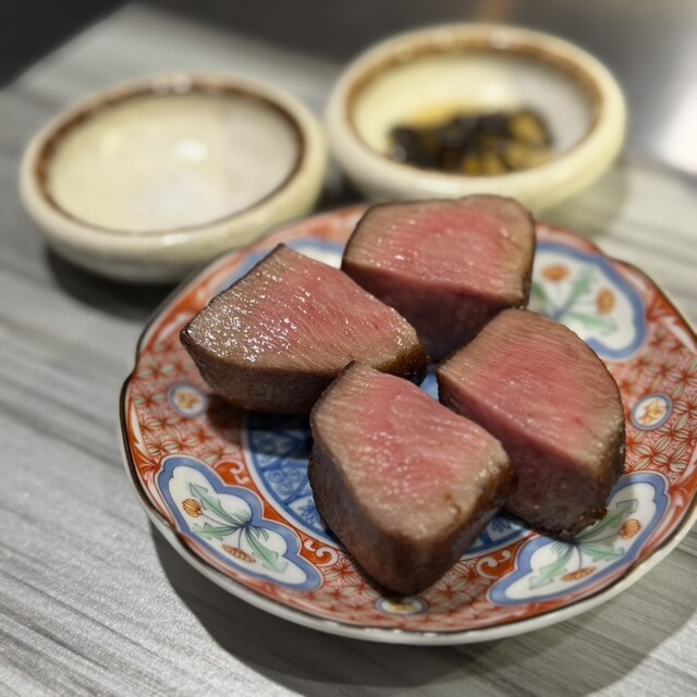 ロシアの甘くないパンケーキ、ブリニーに高級キャビアとソースを乗せて頂く新鮮なスタイルからスタート。大きな極厚タンが来てビックリ。店員さんがしっかりと焼いてくれます。プリップリで食べ応えのある美味しい牛タンでした。