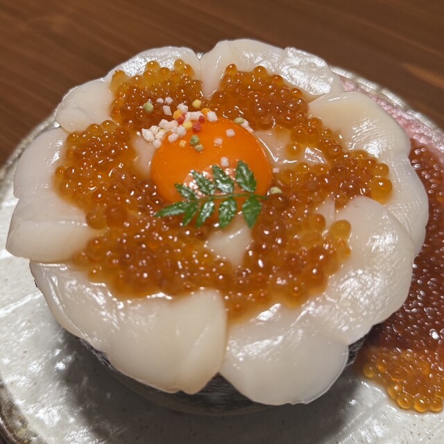 北海道ホタテはプリプリで甘みがあり美味しいです。卵黄と絡めて食べると卵黄の濃厚とホタテの甘みでさらに美味しいです。