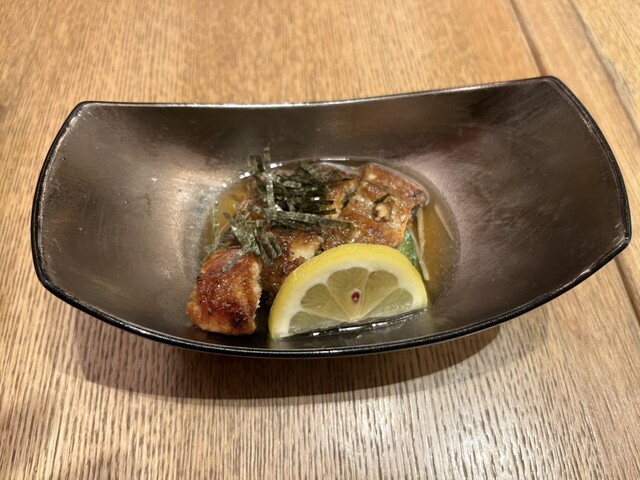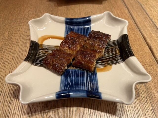 骨せんべいの盛り付けも美しく、その後に来た卵豆腐みたいなのも美味しく、うなぎの肝も湯掻いたものをわさび醤油で食べたり(きも焼きも選びました)、サラダにもふんだんにうなぎが使われていたりなど、たまらなかったです。