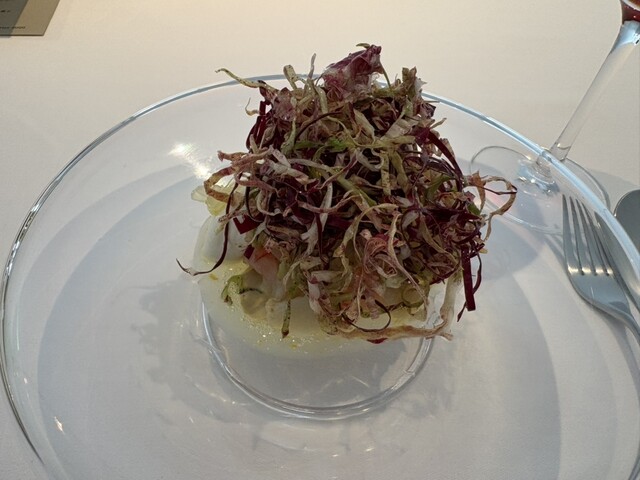 カリフラワーに甘エビ、文旦、柚ソース、胡桃のソース、カリフラワーのムースそしてお野菜がのっていました。ねっとり甘い甘い甘エビとカリフラワー、酸味のある文旦、新鮮でなんとも滑らかなカリフラワーのムース、、