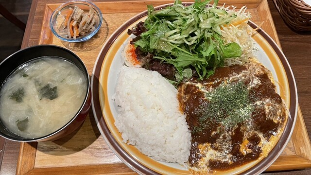 提供された一瞥はハンバーグの上にたっぷりよそおられたソースに埋もれており、お得感ありました。ハンバーグの肉食感よく満喫の一品。最近ではあまり見なかったライスが同じプレートにin。ご飯にソースを絡めて食べることができ、
