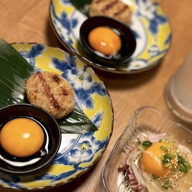 テレビカメラが寄りたくなるビジュアル。チーズ・明太・大根おろしなど個性豊かな味がそろい、炭火で香ばしく焼かれたつくねを卵黄にくぐらせる瞬間は黄金の瞬間