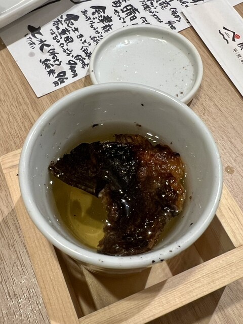 続いて、ふぐのひれ酒を。炙りの香ばしい香りがふわっと立ちのぼる。一気に酔いそうなので、チェイサーをもらいながら、ゆっくり味わう。