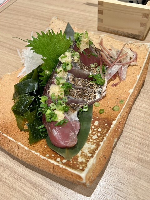 まずはカツオのたたき。にんにくスライスを乗せて口に運ぶと、やっぱり安定のうまさ。酒が進む。