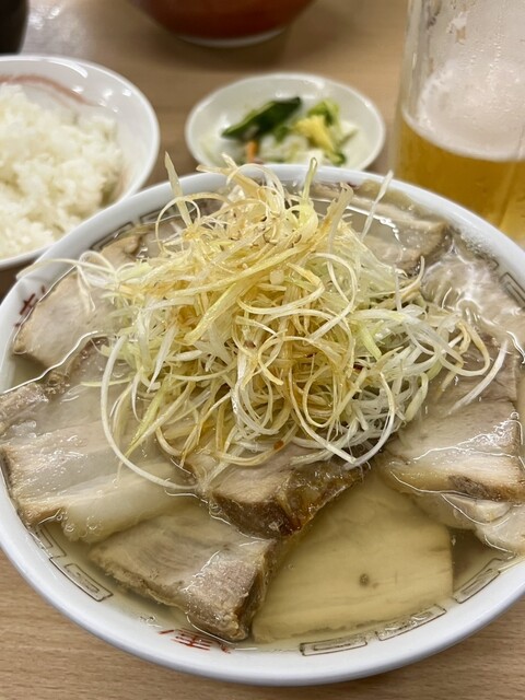 そして、いよいよ着丼。透き通ったスープにたっぷりのチャーシューと白髪ネギ。ビジュアルからしてテンションが上がる。スープをひと口すすると、う、うまい。勝手に某チェーンの上位互換かと思ってたけど、それは大間違い。あっさりだけどとても深みのあるスープ。チャーシューはとろける柔らかさ。平打ちの多加水麺がスープをよく拾い、シャキシャキの白髪ネギとの相性も抜群。ライスも進んで、あっという間の完食。スープまで完飲。