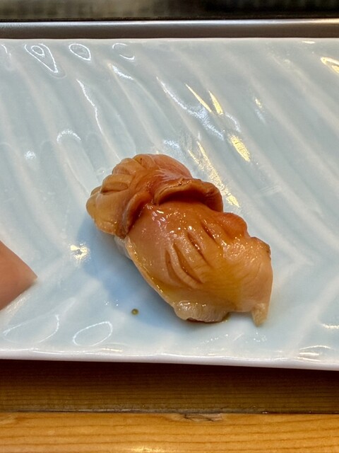 岩手産の生牡蠣はツルッと一気に。ミネラル感と旨みが心地いい。白子ポン酢は温かく、なめらかでコクがある。あん肝は奈良漬と合わせることで甘みが際立つ。つぶ貝は食感と甘みが良く、塩辛は塩梅がちょうどいい。