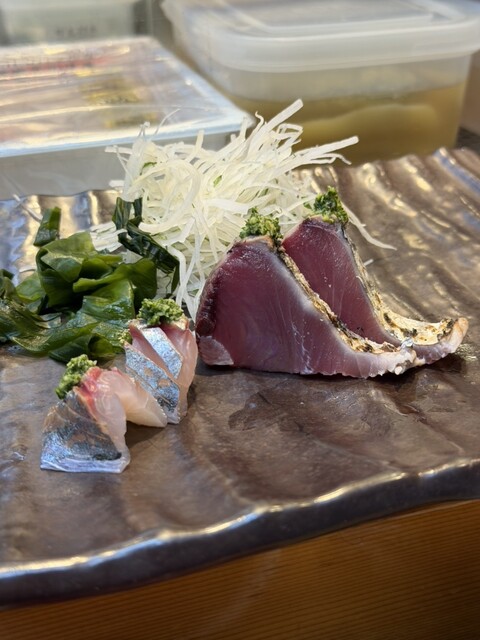 ・まぐろ(赤身・中トロ)、金目、珍しいヒラスズキの4点盛り