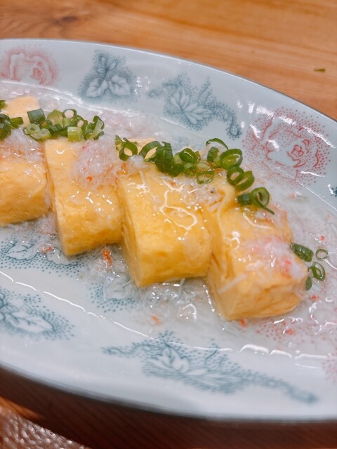 カニの餡掛け載せ卵焼き…!おさかなの皿可愛い〜