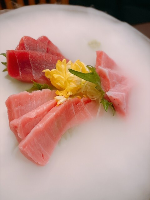 お刺身3点盛りがドライアイス付いててムーディでテンション上がりました!しかも赤身からトロから全部美味しい!