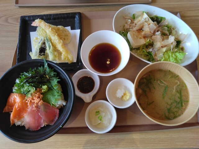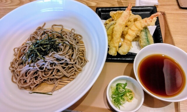 天ぷらと冷やしそばセットと、厚切りとんかつ丼、冷やしうどんを注文。。