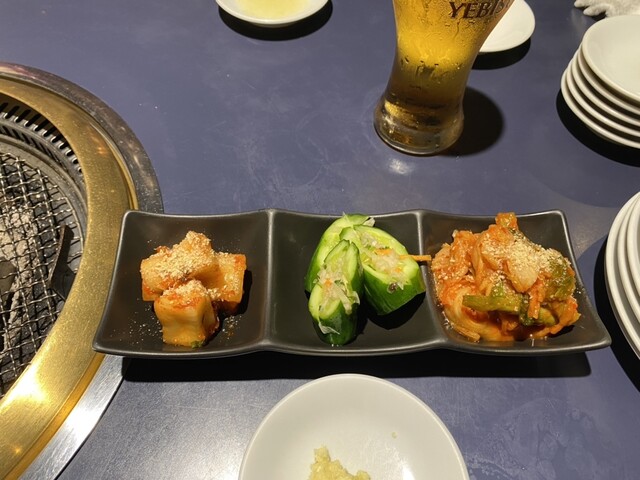 まずはキムチ盛り合わせ。キムチ、オイキムチ、カクテキなんですが、何で焼肉屋さんのは