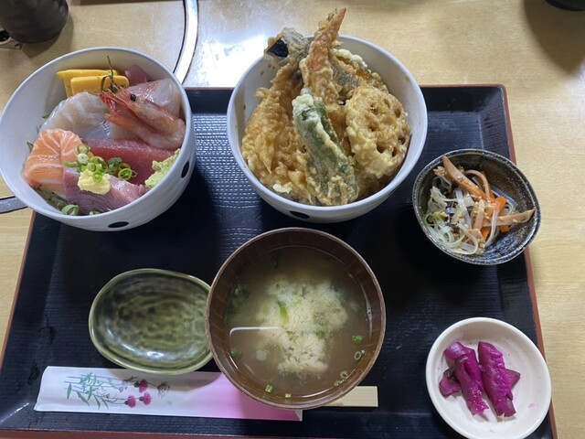 日曜日の12時頃にお伺いさせていただきました。12時頃の来店だったので、行列を覚悟していたのですが待ちは私達と前客の1組のみ。すぐに、前の1組は席に案内され、私達も5分と待たずに席に案内されました。暑い日だったので良かったぁ〜。さて、オーダーですが、私はいつものミニ海鮮丼とミニ天丼セット。ミニとありますが、大盛りも出来るのでミニ?と思っちゃいます...義兄はミニ海鮮丼とミニ天丼セットでご飯少なめを。女性陣はあまり生魚が好きではないので2品選んでお好みランチを(妻はかきフライとかつ煮、娘は鳥唐ユーリンチーとロースカツ)オーダーしました。やはり、美味しい海鮮丼でした。毎回思うのですが、天丼はタレがもう少し汁だくだったら満点でした。私は自分の分は完食しましたが、女性陣は少しきついらしく、カツやかきフライ、かつ煮が食べきれないと...で、2、3切れいただき、またまた腹パンパンになってしまいました。腹パンになるのは分かっていましたが、おビールはやめられませんね。ごちそうさまでした。