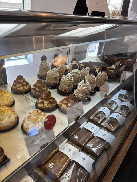 一階でケーキをチョイス、飲み物は紙コップを頂きフリードリンク、お店オリジナルのコーヒー、紅茶、アップルジュースなど選べます。ケーキもいろいろ盛り沢山ですが、今日はこだわりのチーズケーキと季節のモンブランを妻と2人で頂きました。二階のカフェスペースはひろびろ開放感があり、柔らかな採光の間取りで、心地良い雰囲気です。モンブランは栗たっぷり使ったなめらか上品な栗のクリームが美味しいです。チーズケーキは酸味と甘味のバランスが良く、濃厚なチーズの旨味がとてと美味しかったです。お土産にアールグレイのパウンドケーキを買い求め、大変美味しいカフェタイムを楽しませて頂きました。ご馳走様でした。