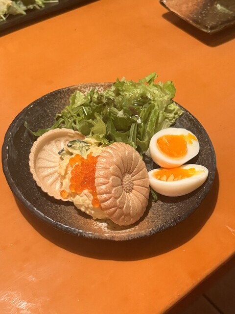 最初に注文した「ホウレンソウといくらのシーザーサラダ」は、シャキシャキのホウレンソウにいくらが絶妙に絡み、食感と味わいのバランスが良い一品でした。「たたききゅうり」はさっぱりとした味付けで、口の中がリフレッシュされます。