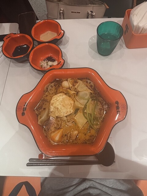 新大久保およそ徒歩1分にある隠れた名店。週1麻辣活動に勤しむ私がおすすめするこのお店。こちらのお店は重さで料金が変わるシステム。まず店内に入ると右手にずらりと豊富な食材。自分の好みの具材をボウルにいれてレジへ。今回は沢山種類がある中basicな旨辛牛骨スープ。辛さも選べるようで中辛を選択(これでも辛いのは得意なほう)(いやきいてない)100g400円で1000円以上で麺を無料で追加できるみたい。おすすめは刀削麺。店内は広く2階建て麻辣湯のお店といえば狭いイメージだがここは広々としていて居心地が良い。お会計が終わり座って待っていると湯気がたつオレンジ色がみえた。熱そうだなと思いながらそっと口に入れると広がる旨み溢れるピリッとした軽やかなスープ。コクがあると同時に刺激的な辛さで口の中に幸せが広がる。おすすめトッピング白身魚とじゃがいもとパクチー。どれも味が染み込んでいてじゃがいもは口に入れた瞬間ほろりと崩れる。途端世界は黒から白にかわり人生煌びやかには輝く。某有名オレンジ色麻辣湯店によく通っているのですが変わらない美味しい味で、お値段は気持ち安めな気がする。