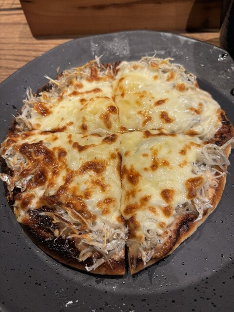 明太子としらすがたっぷり乗ったピザ
