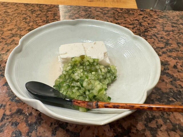 南禅寺豆腐にキュウリ、なす、ミョウガを細かく刻んだもの
