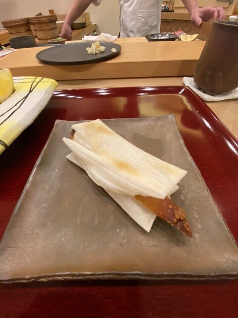 クエ約2週間熟成の皮の湯引き、内臓、刺身から始まり、一つ一つの丁寧な仕事が伺える極上の寿司コースは鮨ネタごとに赤酢と白酢のシャリを使い分けるこだわり。
