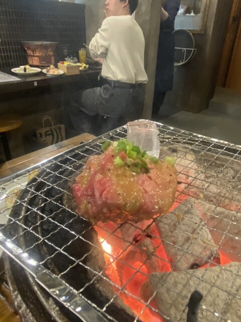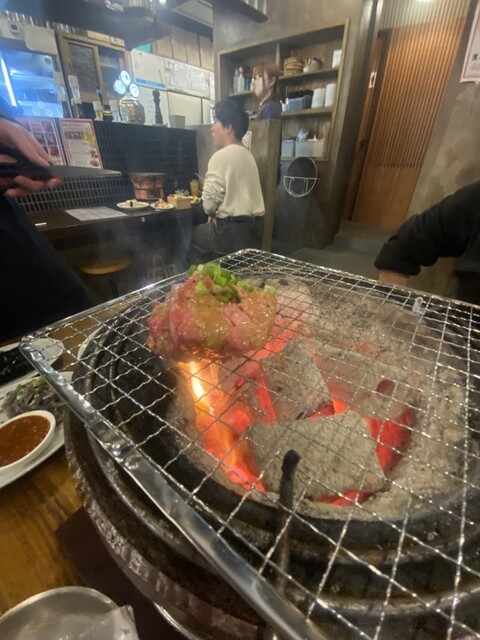 七輪の炭火で焼くスタイルで、入り口には黒毛和牛(一頭買い)を使ったサガリ・ハラミ・タンなどの肉や希少部位を部位ごとにディスプレイ高級焼肉のような装い!