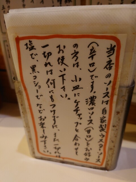個人的には塩が一番好みでしたが、特製のウスターソースや、ウスターソースに自分ですり潰したゴマやカラシを合わせても◎