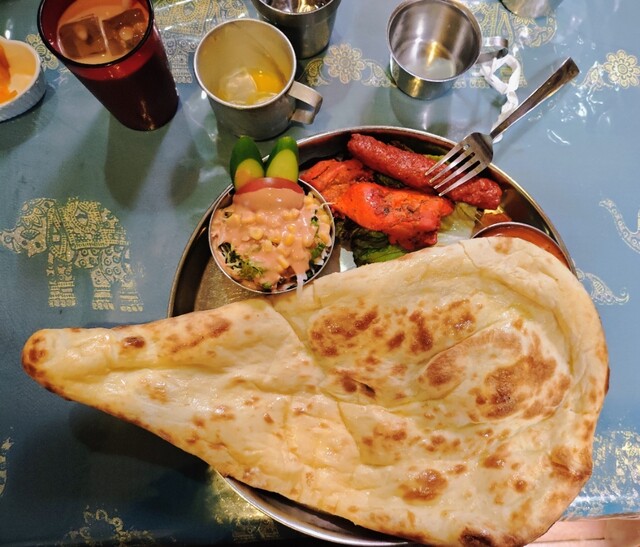 私は辛い物は駄目ですが、ナンの食べ放題に目が眩み、タンドリーミックスセットに。サイズ感分かり難いので、プレート上でナンを折り畳んで分かり易い様に写真撮ってみました。